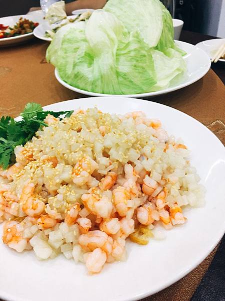 # 生菜蝦鬆:六片萵苣生菜很新鮮,蝦鬆調味也剛剛好不會太油,內容就蠻單純的是蝦子、荸薺、油條和一點芝麻,好吃