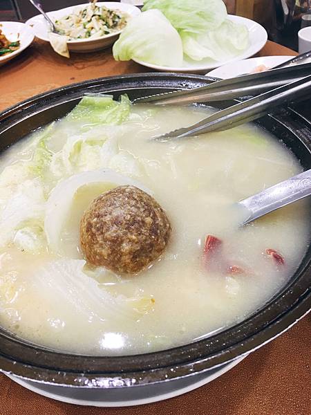 # 火腿白燒獅子頭湯(中):中的有兩顆獅子頭,尺寸一般般,口感是比較軟綿的那種,調味還蠻夠的,味道還不錯,搭配調味偏淡的湯頭是還蠻配的,但我還是比較喜歡一般醬油白菜湯底的獅子頭囉!